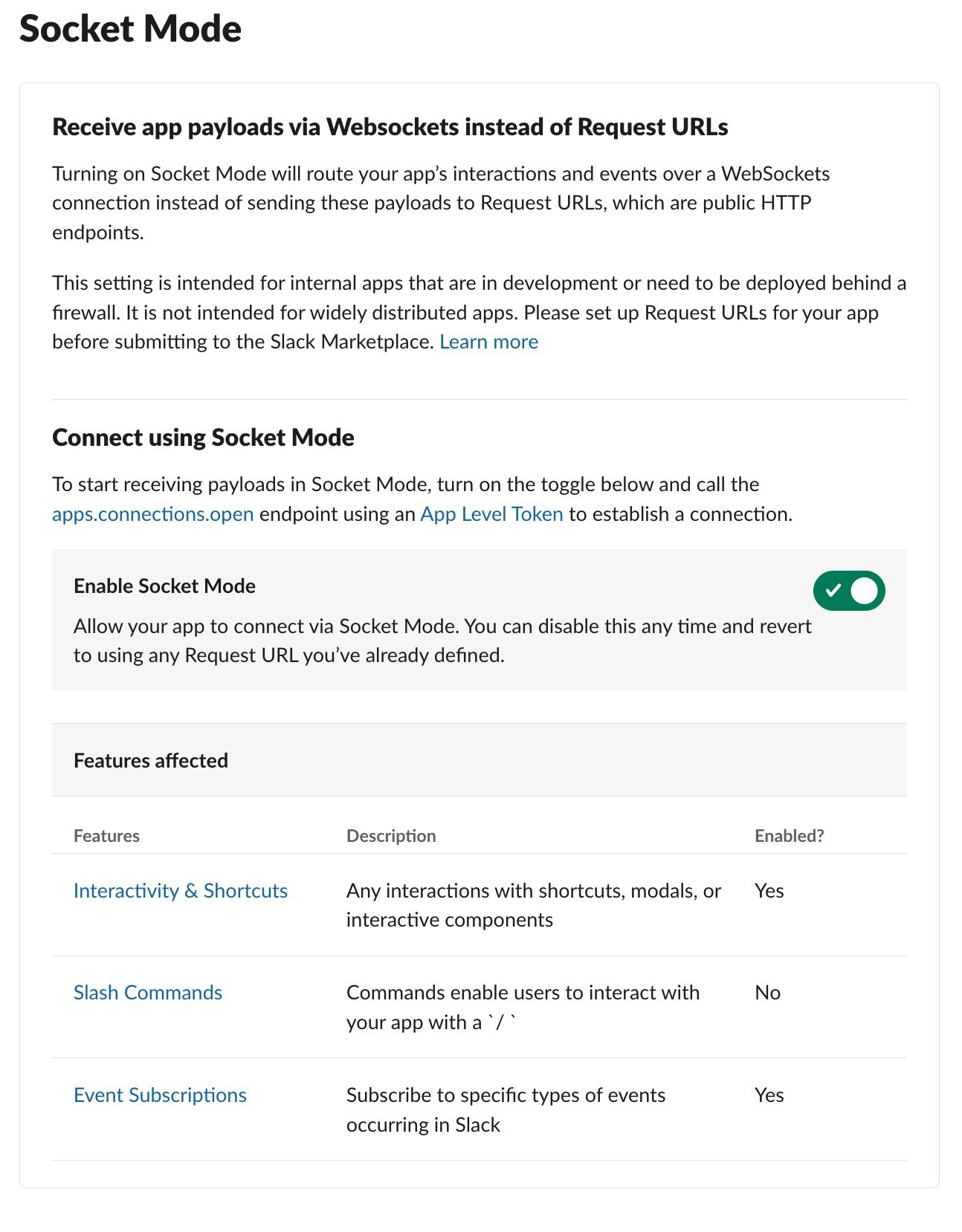- Websocket Mode: This does not require you to open your self-hosted URL to public. To do this, you need to enable the websocket mode (step 3).